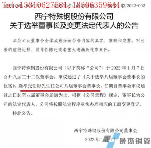 張伯影先生:1970年7月出生,漢族,中共黨員,中國國籍,河北人,大專學(xué)歷,工程師,歷任西寧特殊鋼股份有限公司煉鋼分廠一煉作業(yè)區(qū)作業(yè)長、煉鋼分廠廠長、煉軋分廠廠長、轉(zhuǎn)爐分廠廠長、三煉分廠廠長、鍛鋼分廠廠長、資源事業(yè)部部長、西寧特殊鋼股份有限公司副總經(jīng)理、總經(jīng)理及董事、青海西鋼新材料有限公司董事長,擬任西寧特殊鋼股份有限公司董事。