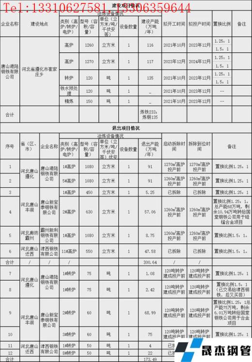 唐山港陸鋼鐵有限公司退出1080m3高爐2座、退出產(chǎn)能182萬噸;75t轉爐2座,退出產(chǎn)能3.5萬噸/年;唐山新寶泰鋼鐵有限公司450m3高爐1座,退出產(chǎn)能5.25萬噸/年;630m3高爐1座,退出產(chǎn)能57.06萬噸/年;60t轉爐2座,退出產(chǎn)能143.99萬噸/年;霸州新利鋼鐵有限公司1080m3高爐1座,退出產(chǎn)能8.75萬噸/年;津西鋼鐵有限公司退出550m3高爐1座,退出產(chǎn)能47.58萬噸/年;50t轉爐2座,退出產(chǎn)能26萬噸/年。共計退出煉鐵產(chǎn)能300.64萬噸,煉鋼產(chǎn)能173.49萬噸,所有項目將于新建項目建成投產(chǎn)前拆除。