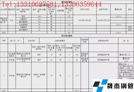 秦皇島佰工鋼鐵有限公司退出60t轉爐2座,產(chǎn)能150萬噸/年;河北吉泰特鋼有限公司退出50t電爐1座,產(chǎn)能30萬噸/年;秦皇島宏興鋼鐵有限公司退出60t轉爐1座,產(chǎn)能1.5萬噸/年。共計退出煉鋼產(chǎn)能181.5萬噸,所有項目將于新建項目建成投產(chǎn)前拆除。