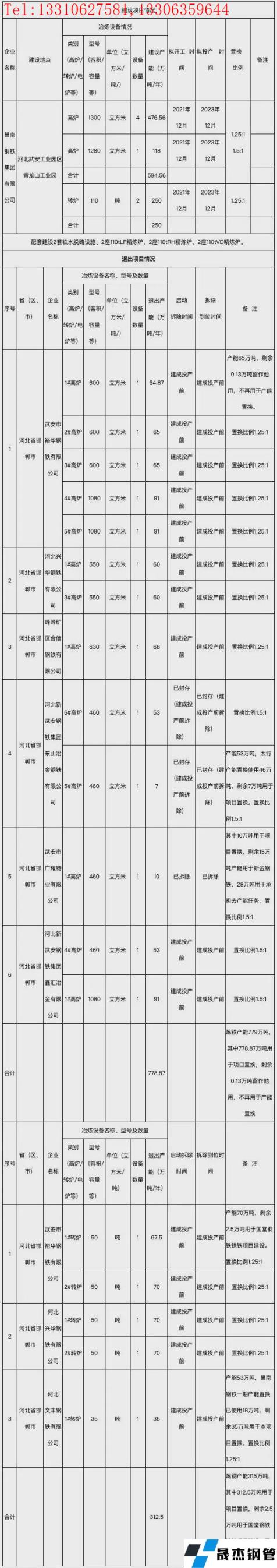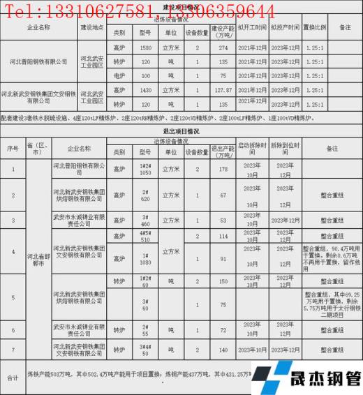 河北普陽鋼鐵有限公司退出高爐1050m3高爐2座,退出產(chǎn)能178萬噸/年。河北新武安鋼鐵集團烘熔鋼鐵有限公司退出620m3高爐1座,退出產(chǎn)能67萬噸/年;退出60t轉爐3座,產(chǎn)能225萬噸/年。武安市永誠鑄業(yè)有限責任公司退出460m3高爐1座,退出產(chǎn)能53萬噸/年;退出55t轉爐1座,產(chǎn)能72萬噸/年。河北新武安鋼鐵集團文安鋼鐵有限公司退出510m3高爐2座,退出產(chǎn)能114萬噸/年;退出1080m3高爐1座,退出產(chǎn)能91萬噸/年;退出50t轉爐2座,產(chǎn)能140萬噸/每年。共計退出煉鐵產(chǎn)能503萬噸,其中502.4萬噸產(chǎn)能用于項目置換;退出煉鋼產(chǎn)能437萬噸,其中431.25萬噸產(chǎn)能用于項目置換,所有項目將于2023年10月前拆除。