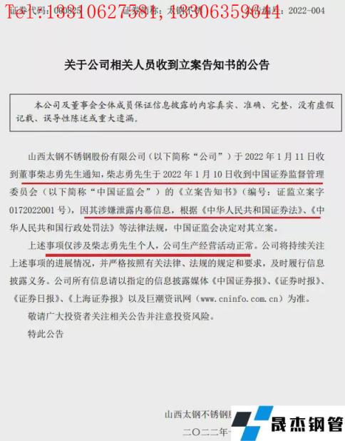 1月12日晚間,“不銹鋼龍頭”太鋼不銹發(fā)布公告稱,公司于2022年1月11日收到董事柴志勇先生通知,柴志勇先生于2022年1月10日收到中國證券監(jiān)督管理委員會的《立案告知書》(編號:證監(jiān)立案字0172022001號),因其涉嫌泄露內(nèi)幕信息,根據(jù)相關(guān)法律法規(guī),中國證監(jiān)會決定對其立案。