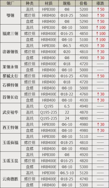 上調(diào)6家,占比50%,調(diào)價幅度30-100元/噸;