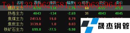 今日螺紋主力期貨跌134,收?qǐng)?bào)4728,跌幅2.76%;熱卷主力跌134,收?qǐng)?bào)4843,跌幅2.69%;焦煤主力漲19,收?qǐng)?bào)2413.5,漲幅0.79%;焦炭主力漲1,收?qǐng)?bào)3139,漲幅0.03%;鐵礦石主力跌77.5,收?qǐng)?bào)699,跌幅9.98%。