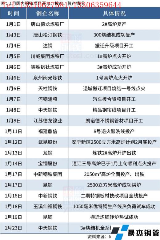 據(jù)不完全整理,2022年1月國內(nèi)20個鋼鐵項(xiàng)目開工、投產(chǎn)和復(fù)產(chǎn)。其中,達(dá)鋼、河鋼浦項(xiàng)、中天鋼鐵和江蘇德龍鎳業(yè)等4個鋼鐵相關(guān)項(xiàng)目開工;唐山德龍煉鐵廠和唐山松汀鋼鐵項(xiàng)目復(fù)產(chǎn);福建鼎信、寶鋼股份、中新鋼鐵和武昆股份等鋼鐵項(xiàng)目投產(chǎn)。具體內(nèi)容如下: