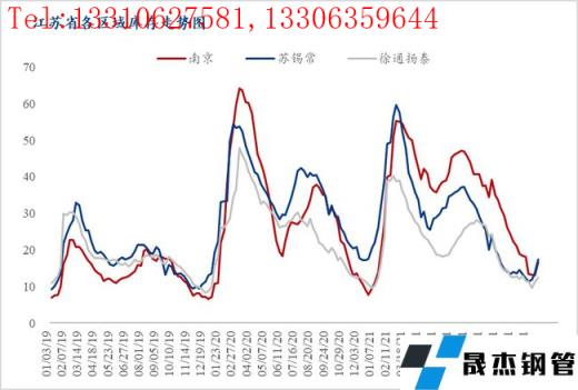 如上圖所示,2020年1月23日省會南京市場庫存占全省現(xiàn)貨庫存的21%左右,屬全年較低水平;而4月9日前后基本占全省庫存的41%;20年上半年南京市場庫存均保持較高水平,而下半年開始庫存便逐漸走低,蘇錫常庫存累庫增加。2021年1月8日南京庫存占全省庫存的24%,從4月初開始到本年度結(jié)束,南京庫存占比基本維持在40-42%左右,11月5日占比最高達到年度最高值,約50/%。2021年全年,南京市場庫存均保持較高水平,僅在年初階段,蘇錫??値齑媛愿哂谀暇?。整體來看,今年南京市場現(xiàn)貨資源一直處于相對充裕的狀態(tài),且部分無縫厚壁鋼管廠家?guī)齑媲耙埔彩潜WC該市場建材供給較為穩(wěn)定的重要因素,而徐通揚泰區(qū)域則因價格波幅巨大,市場參與者主動囤貨意愿不高,全年庫存相較去年小幅減量。