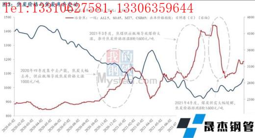 2)而2021年雖沒有再出現(xiàn)2020年4季度集中大幅去產(chǎn)能的情況。但仍出現(xiàn)了2021年三季度焦炭?jī)r(jià)格大漲1600元/噸的情形,兩個(gè)半月漲幅48%,漲幅明顯高于2020年四季度。這主要是由于焦煤供應(yīng)受限導(dǎo)致的煤價(jià)大漲推升焦炭成本大幅上漲,以呂梁低硫主焦煤來看,其價(jià)格從6月底至9月底漲了一倍(2050-4100元/噸),焦炭供應(yīng)矛盾從產(chǎn)能約束轉(zhuǎn)移至原料供應(yīng)受限。同樣的,2021年四季度后,國(guó)家出臺(tái)煤炭保供政策,原料供應(yīng)大幅緩解,同時(shí)需求端鐵水產(chǎn)量大減,最終傳導(dǎo)至焦煤價(jià)格大跌,焦炭?jī)r(jià)格應(yīng)聲回落1600元/噸。