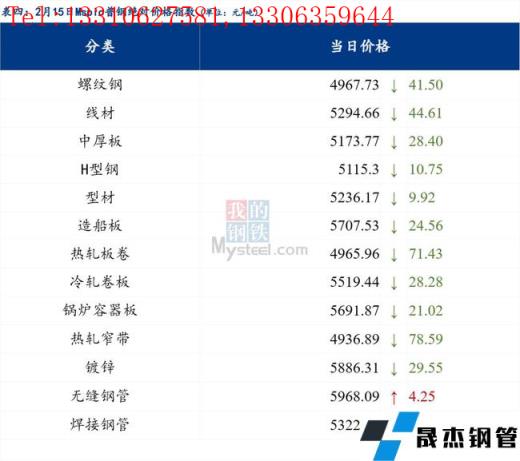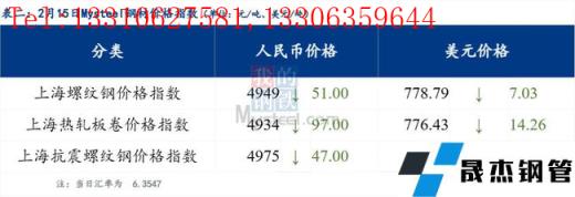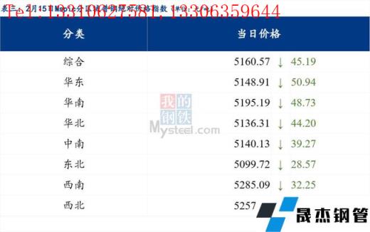 2月15日普鋼絕對價格指數(shù)變化:綜合指數(shù)5160.57,下跌45.19;螺紋鋼指數(shù)4967.73,下跌41.5;線材指數(shù)5294.66,下跌44.61;熱軋板卷指數(shù)4965.96,下跌71.43;冷軋板卷指數(shù)5519.44,下跌28.28;中厚板指數(shù)5173.77,下跌28.4。