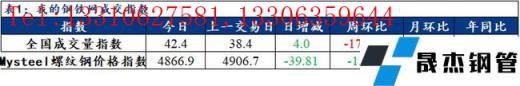 訊:全國(guó)建筑厚壁無(wú)縫鋼管成交量監(jiān)測(cè),成交量相對(duì)指數(shù)來(lái)看,全國(guó)42.4增4,北方15.9增3.7,華東68.5增11.6,南方30.9減3.6。今日螺紋鋼價(jià)格指數(shù)4866.9,較上一交易日減39.81。