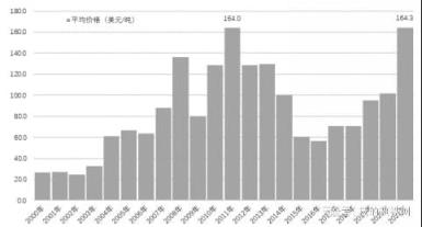 2000年-2021年中國進(jìn)口鐵礦石年度平均價(jià)格走勢圖