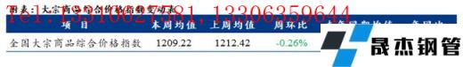 全國大宗商品綜合價(jià)格指數(shù)均值為1209.22,環(huán)比下降,降幅0.26%(前值4.39%);同比上升,增幅15.19%(前值17.06%)。