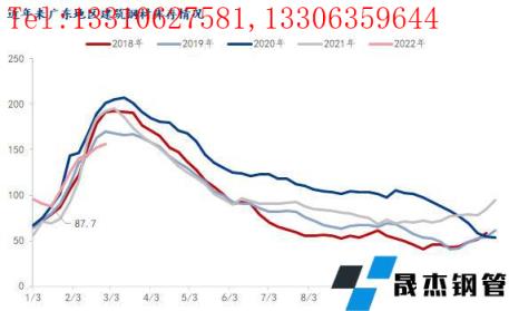 庫(kù)存方面,截止2月28日,根據(jù)廣州建材倉(cāng)庫(kù)同口徑統(tǒng)計(jì),建筑厚壁無(wú)縫鋼管總庫(kù)存156.1萬(wàn)噸,周環(huán)比增加3.92萬(wàn)噸,連續(xù)6周回升。其中螺紋鋼庫(kù)存92.7萬(wàn)噸,周環(huán)比增加5.06萬(wàn)噸;線材63.4萬(wàn)噸,周環(huán)比減少1.14萬(wàn)噸。近年來春節(jié)后廣東省庫(kù)存量均呈現(xiàn)增加態(tài)勢(shì),其中2020年節(jié)后庫(kù)存總量最高;據(jù)調(diào)研,節(jié)后廣東建筑厚壁無(wú)縫鋼管庫(kù)存峰值均出現(xiàn)第3-5周,累庫(kù)周期約24天左右;雖然2022年節(jié)前價(jià)格偏高,但節(jié)前現(xiàn)貨價(jià)格上漲,帶動(dòng)市場(chǎng)不少商家主動(dòng)性囤貨、備貨,節(jié)前庫(kù)存總量并未出現(xiàn)明顯累庫(kù)現(xiàn)象。節(jié)后開市,在疫情等因素影響下,累庫(kù)速度遠(yuǎn)低于往年,因此預(yù)計(jì)短期庫(kù)存仍有增加的可能,但峰值難超去年,且最近2-3周可能會(huì)迎來庫(kù)存拐點(diǎn)。