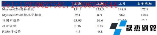 港口現(xiàn)貨與遠期現(xiàn)貨方面:本周五62%澳粉指數(shù)151.1美元/噸,環(huán)比增加17.6美元/噸;62%澳粉現(xiàn)貨指數(shù)981元/噸,環(huán)比增加110元/噸; 65%球團溢價指數(shù)為63.05美元/噸,環(huán)比漲6.45美元/噸; 62.5%塊礦溢價指數(shù)0.36美元/噸度,環(huán)比上漲0.02美元/噸度。本周PB粉遠期浮動溢價-4.5美元/噸,環(huán)比下跌3.70美元/噸。