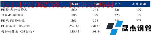 價差方面:本周高低品價差擴大,截至周五青島港PB粉與超特粉價差350元/噸,環(huán)比擴大9元/噸;巴西礦溢價減少,青島港卡粉與PB粉價差205元/噸,環(huán)比收窄6元/噸;粉塊價差收窄,青島港PB塊與PB粉價差363元/噸,環(huán)比收窄29元/噸。期現(xiàn)基差方面:PB粉基差259.32,環(huán)比走弱11.56;超特粉基差-130.43,環(huán)比走弱21.99。