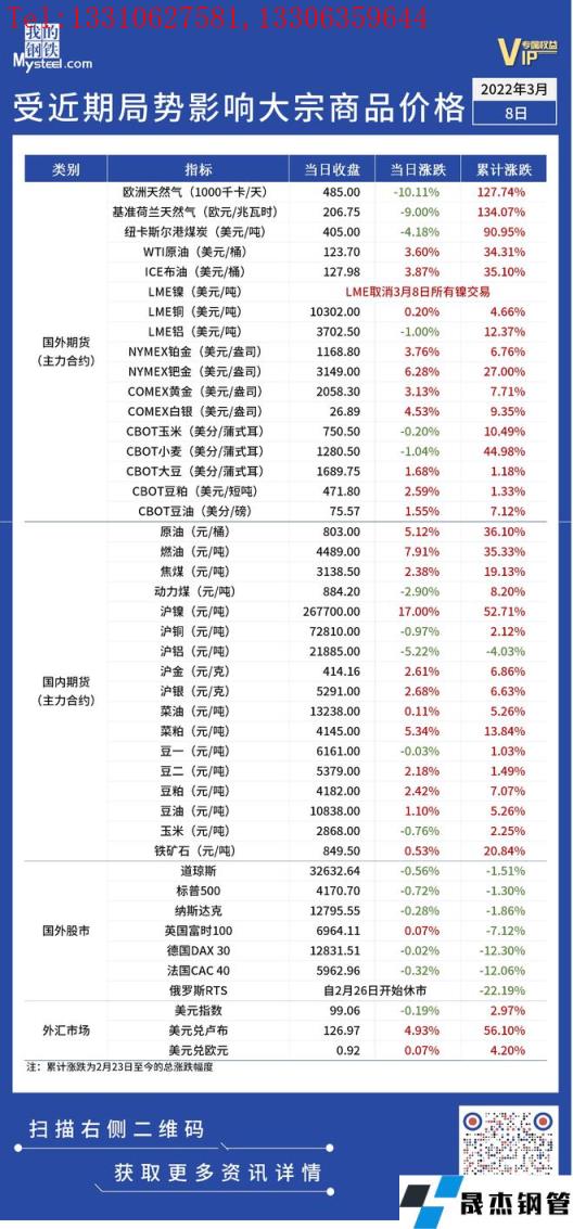 免責聲明:本網站(山東聊城晟杰無縫鋼管廠www.aremjf.cn)刊載的“受近期局勢影響大宗商品價格一覽表(3月8日)”等均源于網絡,版權歸原作者所有,且僅代表原作者觀點,本文所載信息僅供參考。轉載僅為學習與交流之目的,如無意中侵犯您的合法權益,請及時聯(lián)系刪除。本網站刊登此篇文章并不意味著本站贊同其觀點或證實其內容的真實性,我們不對其科學性、嚴肅性等作任何形式的保證。如果侵犯了您的版權,請盡快聯(lián)系我們予以撤銷,謝謝合作!