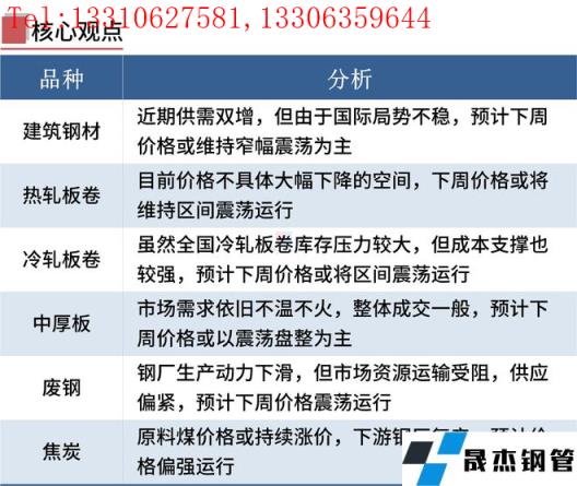 中厚板:3月11日,全國(guó)24個(gè)主要城市20mm普板均價(jià)5248元/噸,較上一交易日跌2元/噸。期貨以震蕩盤整為主,在此影響之下,貿(mào)易商紛紛謹(jǐn)慎觀望,報(bào)價(jià)以窄幅盤整為主。成交方面,市場(chǎng)需求依舊不溫不火,整體成交一般。無縫厚壁鋼管廠家方面,本周無縫厚壁鋼管廠家開工率80.00%,周環(huán)比上升1.54%;無縫厚壁鋼管廠家產(chǎn)能利用率80.54%,周環(huán)比下降2.50%,預(yù)計(jì)下周無縫厚壁鋼管廠家開工率與產(chǎn)能利用率或變化不大。庫存方面,上周無縫厚壁鋼管廠家與社會(huì)庫存小幅減少,總庫存周環(huán)比降2.50%,年同比降7.05%。綜合來看,預(yù)計(jì)下周中厚板價(jià)格或以震蕩盤整為主。