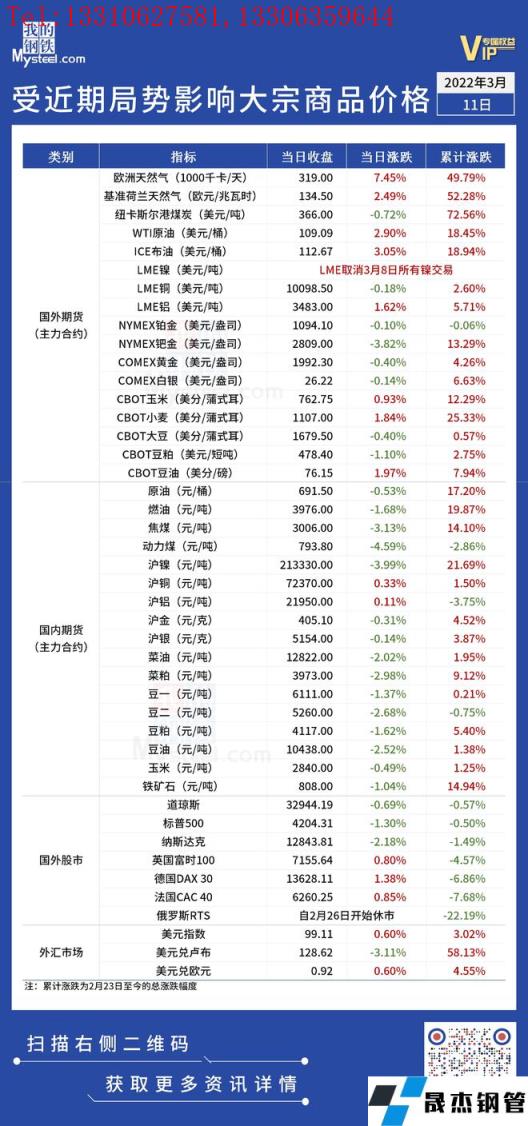 近期,受國際局勢影響,全球金融及大宗商品市場出現較大波動。3月11日,商品及金融市場漲跌互現,波動幅度較前期明顯收窄。匯總情況如下:
