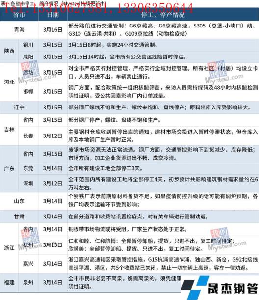 截至3月16日,匯總了10個(gè)省份最新停工停產(chǎn)信息。其中,河北省于3月15日宣布,除張家口、承德、秦皇島市按有關(guān)規(guī)定供暖時(shí)間外,其他法定3月15日停暖的地方供暖時(shí)間統(tǒng)一延長(zhǎng)至3月31日24時(shí)。陜西省銅川市于15日宣布全市范圍內(nèi)實(shí)施24小時(shí)交通管制;咸陽(yáng)市15日宣布全市所有公交營(yíng)運(yùn)路線(xiàn)暫時(shí)停運(yùn)。吉林省部分無(wú)縫厚壁鋼管廠(chǎng)家停產(chǎn),螺紋、盤(pán)線(xiàn)不飽和生產(chǎn)。與此同時(shí),全國(guó)其他地區(qū)鋼貿(mào)交易也受到影響,部分工地開(kāi)始停工,物流運(yùn)輸暫停服務(wù)。具體情況如下:
