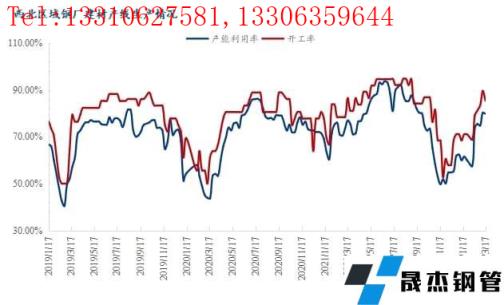 本周西北區(qū)域15家建筑厚壁無縫鋼管生產(chǎn)廠家48條產(chǎn)線實際開工41條,軋線開工率為85.4%,周環(huán)比下降4%;建材產(chǎn)線實際產(chǎn)量約66萬噸,周環(huán)比減少約0.5萬噸,產(chǎn)能利用率為79.8%,周環(huán)比下降0.3%,減量部分主要在陜西LG無縫厚壁鋼管廠家高爐停產(chǎn)兩條軋線同步檢修。