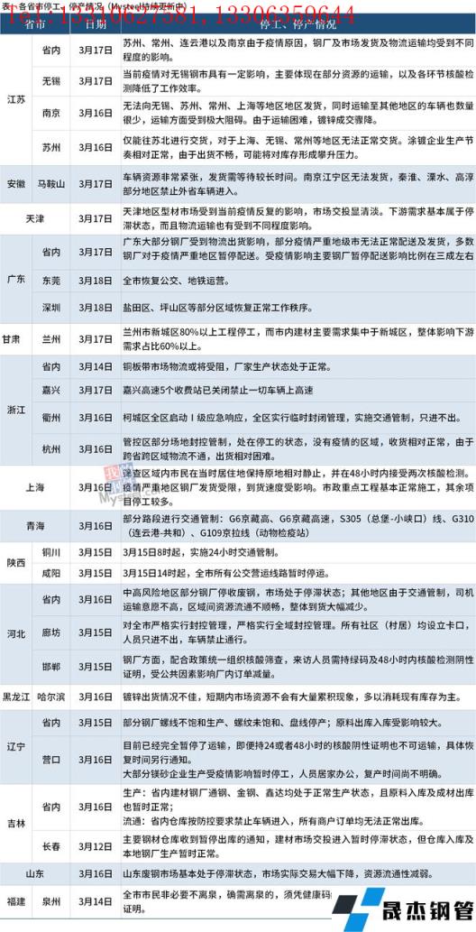 截至3月18日,匯總了15個(gè)省份停工停產(chǎn)最新信息。其中,江蘇省內(nèi)蘇州、常州、連云港以及南京由于疫情原因,無縫厚壁鋼管廠家及市場(chǎng)發(fā)貨及物流運(yùn)輸均受到不同程度的影響。安徽省內(nèi)出現(xiàn)車輛資源非常緊張,發(fā)貨需等待較長時(shí)間等情況,無法向南京江寧區(qū)發(fā)貨,秦淮、溧水、高淳部分地區(qū)禁止外省車輛進(jìn)入。廣東省大部分無縫厚壁鋼管廠家受到物流出貨影響,部分疫情嚴(yán)重地級(jí)市無法正常配送及發(fā)貨,多數(shù)無縫厚壁鋼管廠家對(duì)于疫情嚴(yán)重地區(qū)暫停配送。受疫情影響主要無縫厚壁鋼管廠家暫停配送影響比例在三成左右;東莞全市恢復(fù)公交、地鐵運(yùn)營;深圳鹽田區(qū)、坪山區(qū)等部分區(qū)域恢復(fù)正常工作秩序。具體情況如下: