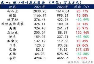 近年來(lái)看,我國(guó)原木主要來(lái)源為新西蘭、美國(guó)、德國(guó)、俄羅斯等地,新西蘭原木進(jìn)口量最為突出, 2021年進(jìn)口量達(dá)2030.95萬(wàn)立方米,主要是輻射松,歷年進(jìn)口體量大,新西蘭輻射松貨源供給也相較德國(guó)云杉穩(wěn)定,因此我國(guó)輻射松價(jià)格變動(dòng)區(qū)間窄于云杉。進(jìn)口德國(guó)的材質(zhì)主要是云杉,自2020到2021年我國(guó)從德國(guó)進(jìn)口的數(shù)量和金額都在明顯增加,數(shù)量上漲比例達(dá)16.88個(gè)點(diǎn),2021年末德國(guó)云杉外盤(pán)價(jià)持續(xù)上揚(yáng)至今,對(duì)我國(guó)云杉接貨成本也造成沖擊,而受困于國(guó)內(nèi)基建行業(yè)景氣指數(shù)下行,市場(chǎng)價(jià)上行比例難以覆蓋成本上行比例,作為建筑木方材料云杉的利潤(rùn)率也在不斷壓縮。