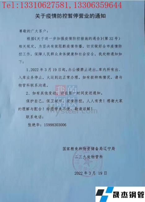 目前沈陽厚壁無縫鋼管中心批發(fā)市場已發(fā)布通告,19日起北一西路東西樓試試封閉管控、嚴(yán)禁人員進(jìn)入辦公,出庫業(yè)務(wù)暫停、火車到達(dá)正常辦理;中國兵工物資125庫通告19日起嚴(yán)禁人員進(jìn)入庫區(qū)辦公,出庫業(yè)務(wù)暫停、火車到達(dá)正常辦理;國家糧食和物資儲備局遼寧局二三九處通告19日起辦公樓嚴(yán)禁進(jìn)出,庫內(nèi)所有出入庫業(yè)務(wù)暫停、火運(yùn)到達(dá)正常辦理。市內(nèi)其他主要厚壁無縫鋼管市場反饋暫時正常辦公及出庫,但從防控指揮部通告內(nèi)容來看、也有暫停營業(yè)的傾向。(通告見文末圖片)