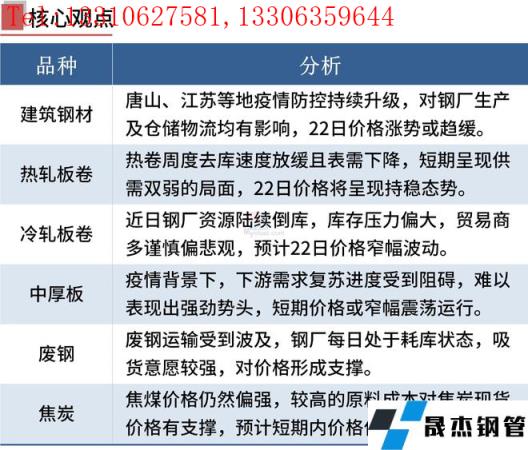 國內(nèi)多省市升級(jí)調(diào)整疫情防控,下游工地施工進(jìn)度放緩,導(dǎo)致鋼市成交量下滑。無縫厚壁鋼管廠家生產(chǎn)影響相對較小,但若唐山交通管制持續(xù),不排除高爐廠也會(huì)減產(chǎn)或停產(chǎn)。短期內(nèi),鋼市供需基本面偏弱,成本支撐力度較強(qiáng)。在重大利好政策出臺(tái)以及全國疫情得到有效控制之前,鋼價(jià)或繼續(xù)震蕩運(yùn)行。