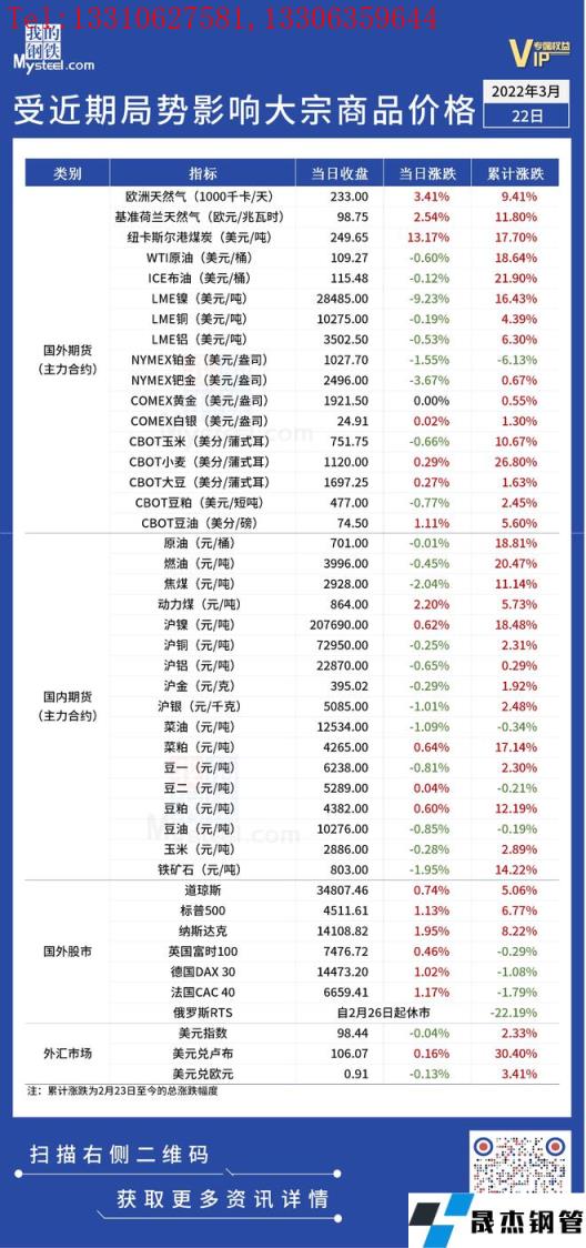 近期,受國際局勢影響,全球金融及大宗商品市場出現(xiàn)較大波動。3月22日,國際油價、金屬普跌。匯總情況如下: