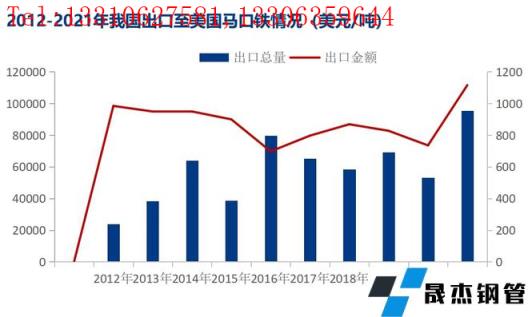 在之前的加征關稅從10%上調至25%的產品清單中就包含馬口鐵品種,2021年是近年來最大值9.5萬噸,占當年出口總量的7.04%。出口量前十位的國家分別為意大利、泰國、南非、墨西哥、美國、阿拉伯聯(lián)合酋長國、西班牙、菲律賓、馬來西亞、沙特阿拉伯,美國出口總量排第五位。但從下圖2012-2021年我國馬口鐵出口至美國馬口鐵總量情況看出,在加征關稅后對我國出口至美國的量并未發(fā)生明顯變化,雖然2020年出現了明顯下滑,主要因為當年全球疫情爆發(fā)美國多企停工停產訂單減少,而當時我國馬口鐵出口卻逆勢增長同時轉移至其他國家,2021年同比增長明顯。