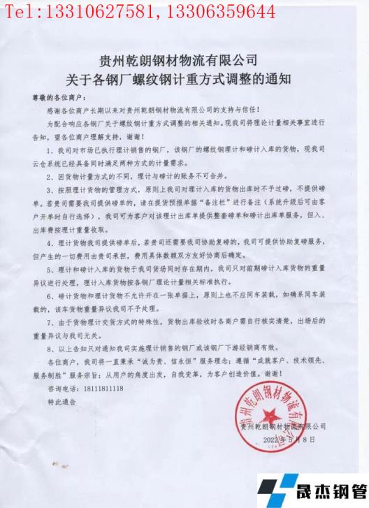 免責(zé)聲明:本網(wǎng)站(山東聊城晟杰無(wú)縫鋼管廠www.aremjf.cn)刊載的“貴州乾朗鋼材_無(wú)縫鋼管物流有限公司關(guān)于各無(wú)縫鋼管廠家螺紋鋼計(jì)重方式調(diào)整的通知”等均源于網(wǎng)絡(luò),版權(quán)歸原作者所有,且僅代表原作者觀點(diǎn),本文所載信息僅供參考。轉(zhuǎn)載僅為學(xué)習(xí)與交流之目的,如無(wú)意中侵犯您的合法權(quán)益,請(qǐng)及時(shí)聯(lián)系刪除。本網(wǎng)站刊登此篇文章并不意味著本站贊同其觀點(diǎn)或證實(shí)其內(nèi)容的真實(shí)性,我們不對(duì)其科學(xué)性、嚴(yán)肅性等作任何形式的保證。如果侵犯了您的版權(quán),請(qǐng)盡快聯(lián)系我們予以撤銷,謝謝合作!
