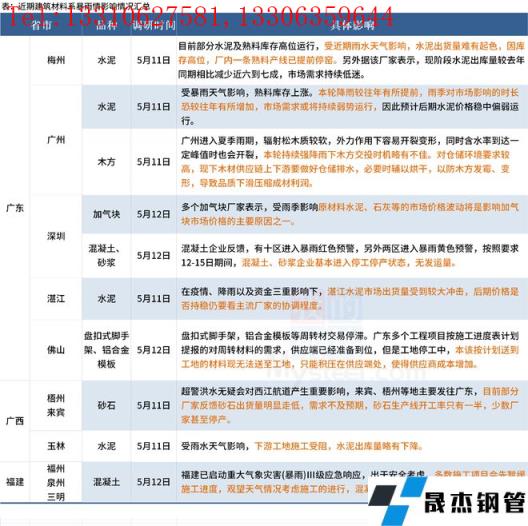 截至5月12日,據(jù)百年建筑網(wǎng)調(diào)研,3省建材市場和建筑工地進(jìn)度受到明顯影響。本次降雨是今年以來廣東遭遇強(qiáng)度最強(qiáng)、范圍最廣、持續(xù)時間最長的強(qiáng)降水過程,城鄉(xiāng)積澇和地質(zhì)災(zāi)害風(fēng)險極高,嚴(yán)重影響水泥企業(yè)出庫。目前降雨情況來看,多數(shù)施工項目會先暫緩施工進(jìn)度,觀望天氣情況再考慮施工的進(jìn)行。具體情況如下: