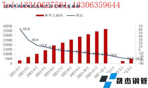 2022年以來,從上圖可以看出來,受住房不炒政策受影響,西北區(qū)域各省市房地產(chǎn)開發(fā)進(jìn)度緩慢,房地產(chǎn)開發(fā)企業(yè)投資完成額以及新開工面積同比均是小幅下降。分省市來看,陜西作為西北經(jīng)濟(jì)龍頭老大,房地產(chǎn)開發(fā)投資表現(xiàn)較好。2022年一季度,陜西省房地產(chǎn)開發(fā)企業(yè)完成投資674.03億元,同比增長(zhǎng)5%,比1-2月提高1.8個(gè)百分點(diǎn)。而甘肅區(qū)域,一季度GDP同比增長(zhǎng)5.3%,固定資產(chǎn)投資同比增長(zhǎng)12.9%。其中,項(xiàng)目投資增長(zhǎng)13.4%,房地產(chǎn)開發(fā)投資增長(zhǎng)11.7%,商品房銷售面積下降10.7%。另外如分別是寧夏區(qū)域房地產(chǎn)開發(fā)投資增長(zhǎng)增速為-1%。這在去年寧夏區(qū)域房地產(chǎn)開發(fā)投資增速為正數(shù),今年面臨較大下行壓力。整體來說,由于受疫情以及資金問題,工程項(xiàng)目進(jìn)度不如預(yù)期,厚壁無縫鋼管需求量同比減少,這也是前期西北區(qū)域建筑厚壁無縫鋼管消化緩慢以及庫存積壓原因。