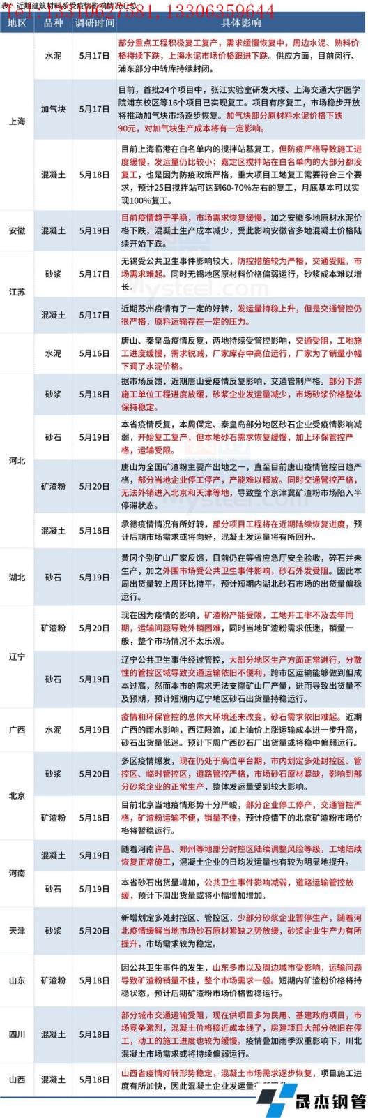 截至5月20日,據(jù)百年建筑網(wǎng)調(diào)研,14個省份建材市場受到了不同程度的影響。隨著華東、華南疫情和暴雨情況的緩解,物流運(yùn)輸逐步恢復(fù)正常,材料進(jìn)場速度加快,下游工地施工節(jié)奏提升。在疫情有效管控下,基建、房建方面的需求陸續(xù)回升,但由于疫情反復(fù)抬頭的影響,仍有上行空間有限。具體情況如下:
