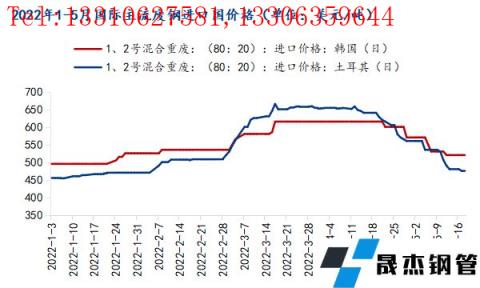 因成品銷售低迷,土耳其無縫厚壁鋼管廠家連續(xù)幾周遠(yuǎn)離深海廢鋼采購,近期開始恢復(fù)采購,據(jù)調(diào)研,截止5月20日,土耳其HMS1:2(80:20)廢鋼到岸價在475美元/噸左右,距離3月份的高點大幅下降190美元/噸,離年內(nèi)低點約21美元/噸。韓國也因海外廢鋼價格的大幅走低,連續(xù)4周未對日本廢鋼進行采購,截止5月20日,韓國HMS1:2(80:20)廢鋼到岸價在520美元/噸,距離3月份的高點跌95美元/噸,離年內(nèi)低點約21美元/噸。截止目前,國際主流廢鋼進口國廢鋼價格較年內(nèi)峰值大跌近百美元,多接近于年內(nèi)低點。