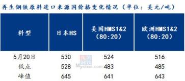 進入5月,日本東京制鐵廢鋼采購價格已經(jīng)歷了六連跌,5月份的關(guān)東鐵源出口招標(biāo)會,又再現(xiàn)流標(biāo)局面。據(jù)調(diào)研,截止5月20日,日本HS廢鋼到岸價在530美元/噸左右,距離4月初的高點大幅下降115美元/噸,近乎已回到年內(nèi)低點;截止5月20日,美國HMS1:2(80:20)廢鋼到岸價在524美元/噸,距離4月份的高點跌117美元/噸,離年內(nèi)低點約41美元/噸;截止5月20日,歐洲HMS1:2(80:20)廢鋼到岸價在516美元/噸,距離4月份的高點跌127美元/噸,離年內(nèi)低點約31美元/噸;當(dāng)前歐美再生鋼鐵原料價格已接近年內(nèi)低點,日本再生鋼鐵原料的價格更是已回到了年初水平。