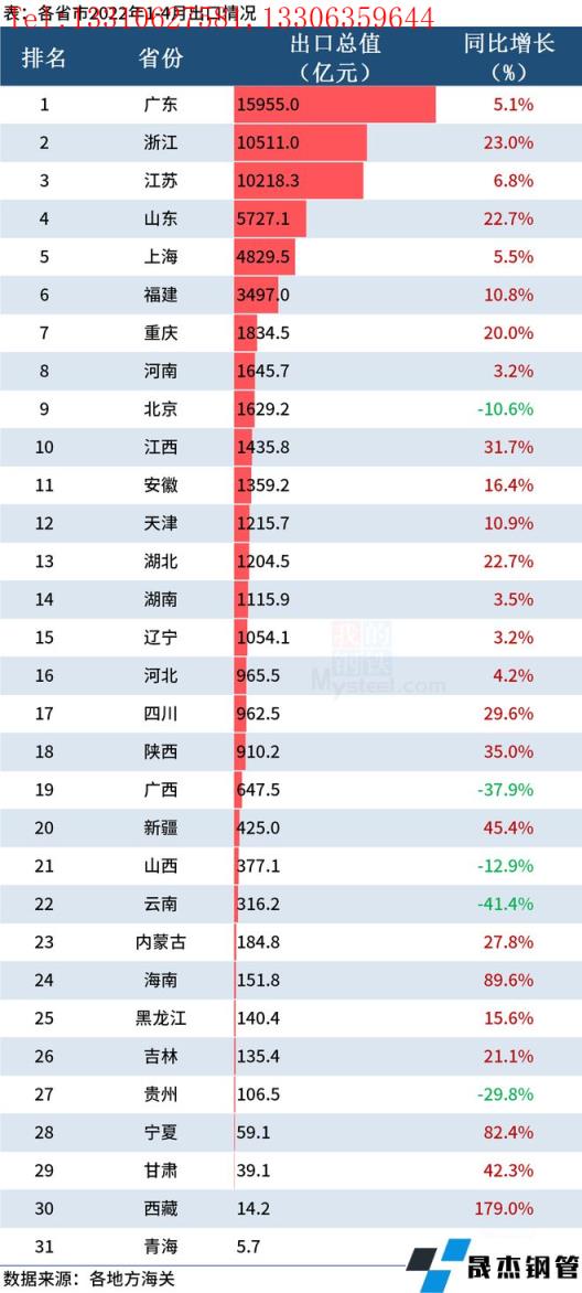 免責聲明:本網(wǎng)站(山東聊城晟杰無縫鋼管廠www.aremjf.cn)刊載的“前4月全國分省市外貿(mào)數(shù)據(jù)出爐,19地出口增速超10%”等均源于網(wǎng)絡,版權(quán)歸原作者所有,且僅代表原作者觀點,本文所載信息僅供參考。轉(zhuǎn)載僅為學習與交流之目的,如無意中侵犯您的合法權(quán)益,請及時聯(lián)系刪除。本網(wǎng)站刊登此篇文章并不意味著本站贊同其觀點或證實其內(nèi)容的真實性,我們不對其科學性、嚴肅性等作任何形式的保證。如果侵犯了您的版權(quán),請盡快聯(lián)系我們予以撤銷,謝謝合作!