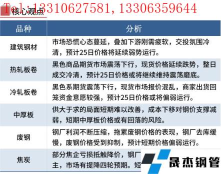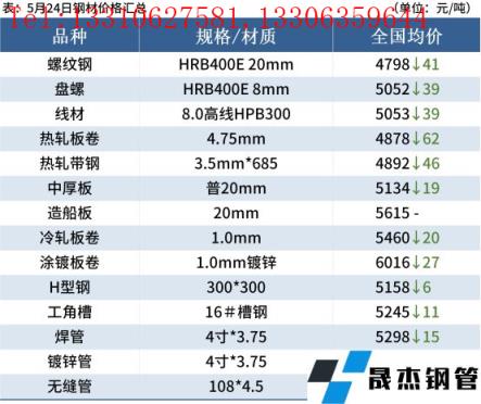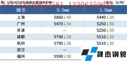 冷軋板卷:5月24日,全國24個主要城市1.0mm冷卷均價5460元/噸,較上個交易日下跌20元/噸。隨著昨日黑色系期貨夜盤震蕩下行,今日現(xiàn)貨市場價格小幅下跌,部分市場報價混亂;據(jù)悉,當前上海倉庫基本上都可以加工和提貨,臨近訂貨時期,商家出貨回籠資金意愿較強。綜合來看,預計25日國內(nèi)冷軋板卷現(xiàn)貨價格或將偏弱運行。