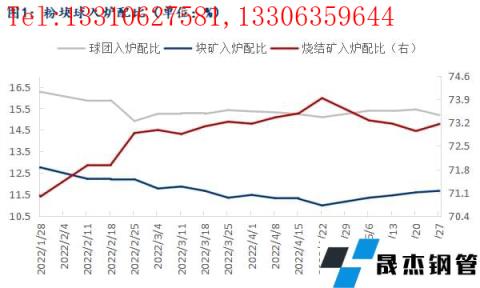 自今年春節(jié)開始,無縫厚壁鋼管廠家高爐中粉礦、塊礦、球團入爐配比變化趨勢明顯。截至5月27日, 64 家無縫厚壁鋼管廠家燒結(jié)礦配比73.2%,環(huán)比1月29日增加2.2個百分點,同比去年同期增加1.8個百分點;塊礦入爐比例11.7%,環(huán)比春節(jié)期間下降1.1個百分點,同比降0.3個百分點;球團入爐配比15.2%,環(huán)比亦下降1.1個百分點,同比降1.4個百分點。