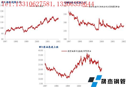 在此次加息周期中,美元、黃金和原油同時上漲,期間漲幅分別達到8.25%、4.78%和54.12%。其中黃金走勢較為特殊,1999年金價處于歷史低谷,9月26日歐洲15國央行協(xié)議限制黃金拋售量后金價飆漲,隨后金價隨著美元指數(shù)走強而震蕩回落,整體上加息期間小幅上漲。