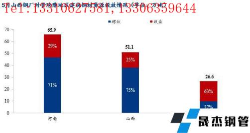 在統(tǒng)計的11家山西無縫厚壁鋼管廠家中,5月份向晉陜豫地區(qū)建筑厚壁無縫鋼管資源投放總量為143.6萬噸,其中螺紋94.6萬噸,占比為66%,線盤49萬噸,占比為34%。分區(qū)域來看,對山西地區(qū)投放51.1萬噸,占比為36%;對河南地區(qū)投放65.9萬噸,占比為46%;對陜西地區(qū)投放26.6萬噸,占比為19%。據(jù)數(shù)據(jù)顯示,5月份山西無縫厚壁鋼管廠家向晉陜豫地區(qū)投放建筑厚壁無縫鋼管資源總量較4月份增加24.27萬噸。分區(qū)域來看,5月對山西地區(qū)的投放增量最大,主要是山西區(qū)域價格持續(xù)高于周邊市場,山西省內(nèi)資源多在省內(nèi)消化為主。