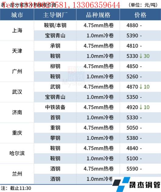 ◎天津:7日早盤冷軋市場價格下調(diào)30元/噸,1.0天鐵5340元/噸;首鋼5330元/噸,唐鋼5300元/噸,成交一般。(單位:元/噸)