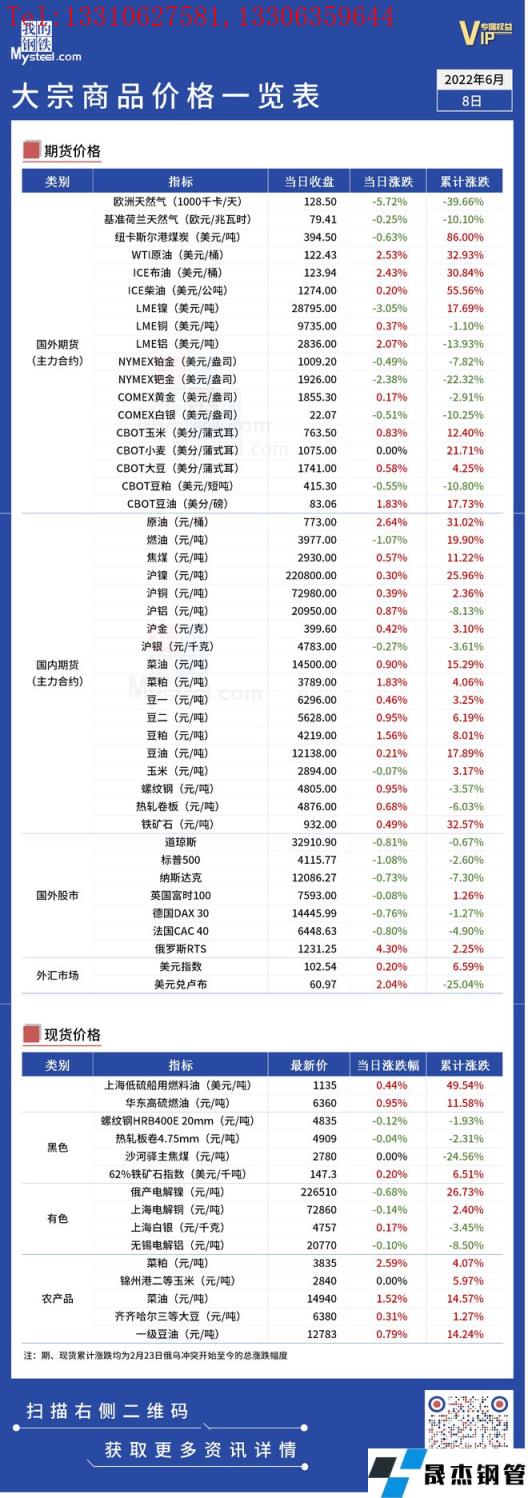 免責(zé)聲明:本網(wǎng)站(山東聊城晟杰無縫鋼管廠www.aremjf.cn)刊載的“俄烏局勢丨大宗商品價格一覽表(6月8日)”等均源于網(wǎng)絡(luò),版權(quán)歸原作者所有,且僅代表原作者觀點,本文所載信息僅供參考。轉(zhuǎn)載僅為學(xué)習(xí)與交流之目的,如無意中侵犯您的合法權(quán)益,請及時聯(lián)系刪除。本網(wǎng)站刊登此篇文章并不意味著本站贊同其觀點或證實其內(nèi)容的真實性,我們不對其科學(xué)性、嚴肅性等作任何形式的保證。如果侵犯了您的版權(quán),請盡快聯(lián)系我們予以撤銷,謝謝合作!