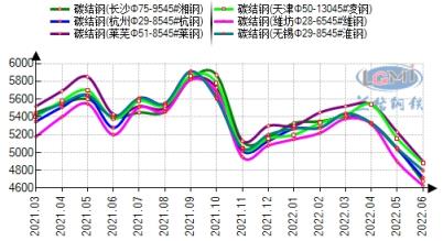 據(jù)云商平臺監(jiān)測數(shù)據(jù)顯示,截至6月30日,全國十大主導(dǎo)城市碳結(jié)鋼(45#)平均價格4848元,較年初跌398元。合結(jié)鋼(40Cr)平均價格5097元,較年初跌363元。