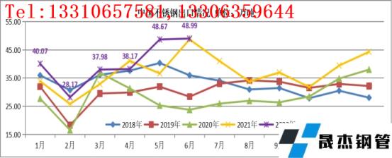 2022年6月份,中國不銹鋼出口量為48.99萬噸,創(chuàng)歷史新高!環(huán)比增加0.32萬噸,增幅0.65%;同比增加0.29萬噸,增幅0.61%。