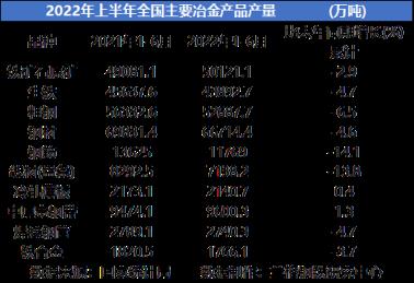 表1 2022年上半年全國主要冶金產(chǎn)品產(chǎn)量