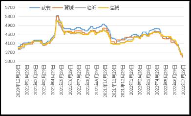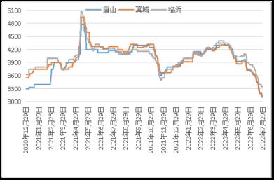 據(jù)云商平臺(tái)監(jiān)測(cè)數(shù)據(jù)顯示,截至7月29日,煉鋼生鐵天津地區(qū)報(bào)價(jià)3120元(噸價(jià),下同),較月初跌550元;唐山地區(qū)報(bào)價(jià)3150元,較月初跌550元;翼城地區(qū)報(bào)價(jià)3100元,較月初跌620元;臨沂地區(qū)報(bào)價(jià)3350元,較月初跌500元(詳見(jiàn)圖2)。