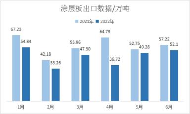 2022年6月我國(guó)涂層板(帶)出口總量共計(jì)52.10萬(wàn)噸,月環(huán)比上升5.73%,年同比下降8.94%。2022年1-6月我國(guó)涂層板(帶)出口總量共計(jì)273.49萬(wàn)噸,年同比下降19.12%。
